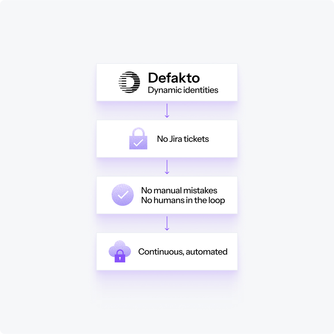 Defakto eradicates static secrets by issuing short-lived identities at runtime. No vaults. No rotations. No humans in the loop.